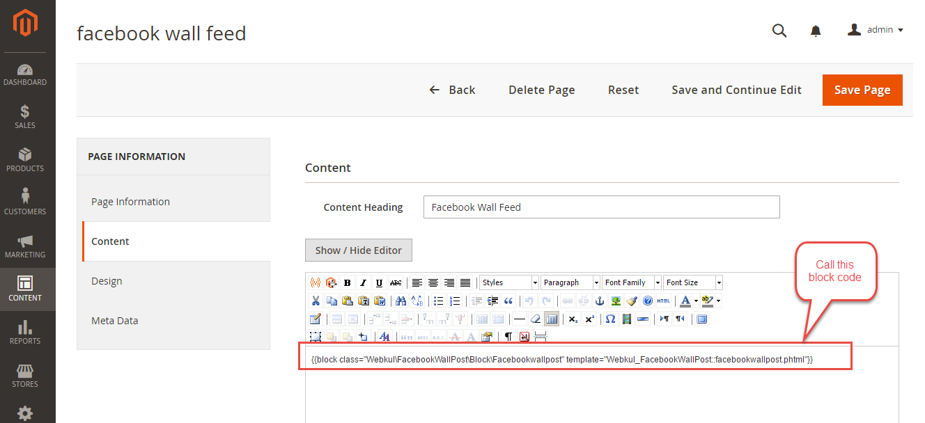 Now, the admin will follow the path Content > Pages > facebook wall feed > content and call this block code {{block class=”Webkul\FacebookWallPost\Block\Facebookwallpost” template=”Webkul_FacebookWallPost::facebookwallpost.phtml”}}