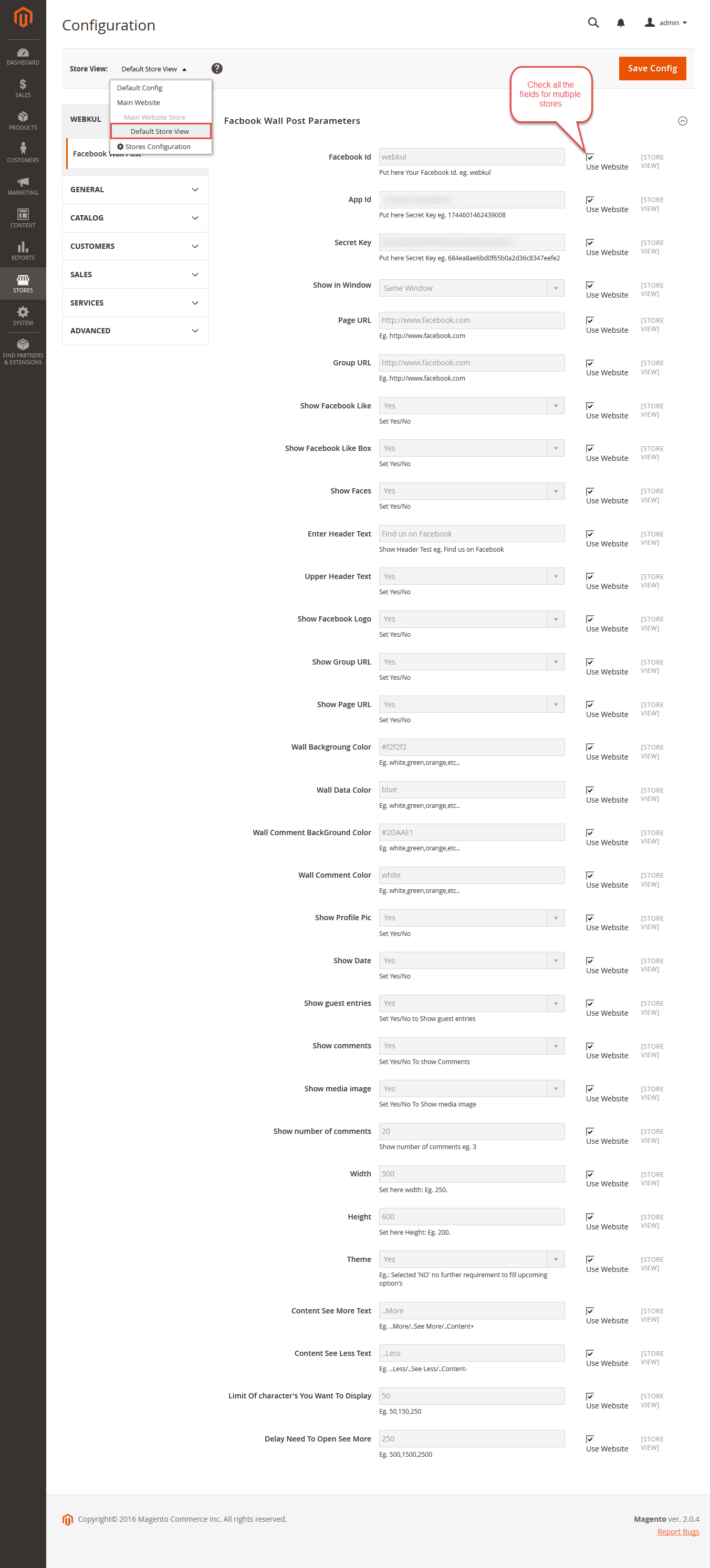 For the module configuration, the admin will follow the path Stores > Configuration > Facbook Wall Post Parameters and enter all the details like Facebook Id, App Id, Secret Key and other important details and then save the configuration.